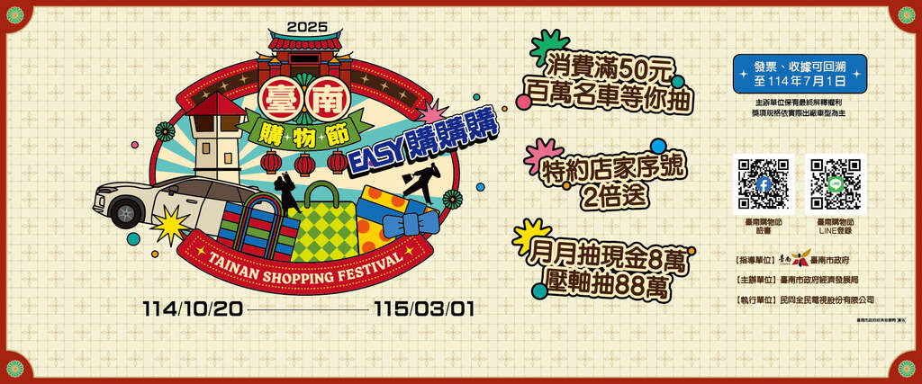 活动资讯活动日期 2025-10-20~2026-03-01讯息内容2025台南购物节正式开跑 活动期间自114年10月20日至115年3月1日止(消费凭证发票、收据追溯至114年7月1日起),消费者在本市店家消费,登录活动官网或购物节官方LINE,累计满50元就有机会获得现金、百万名车等多项好礼。 在特约店家消费还能加倍送序号,中奖机率直接 UP!UP!UP! 更多详情请参阅活动官方网站 相关连结2025台南购物节活动官方网站相关照片 问题回报上一则 回列表 下一则