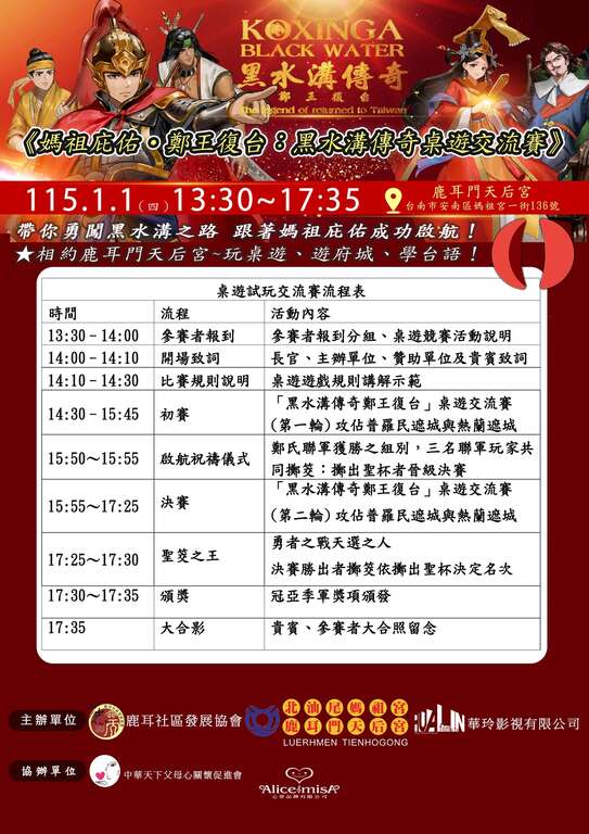 影视IP《黑水沟传奇》华玲影视有限公司携手鹿耳门天后宫、鹿耳社区发展协会,共同举办「妈祖庇佑・郑王复台:黑水沟传奇桌游交流赛」,邀请大家在游戏与互动中,认识台湾开台历史、感受府城文化魅力。