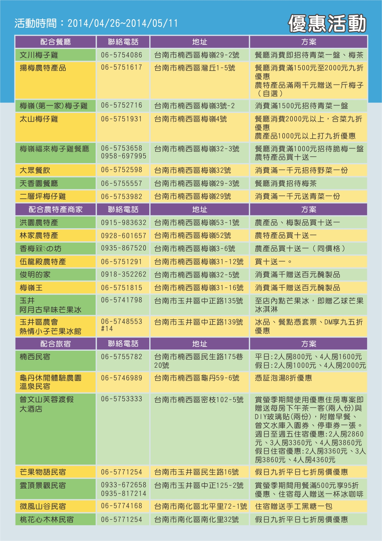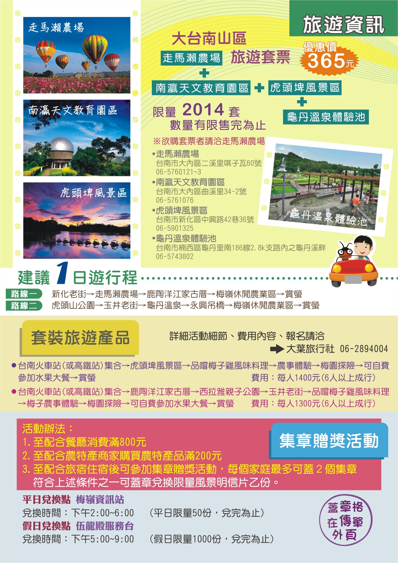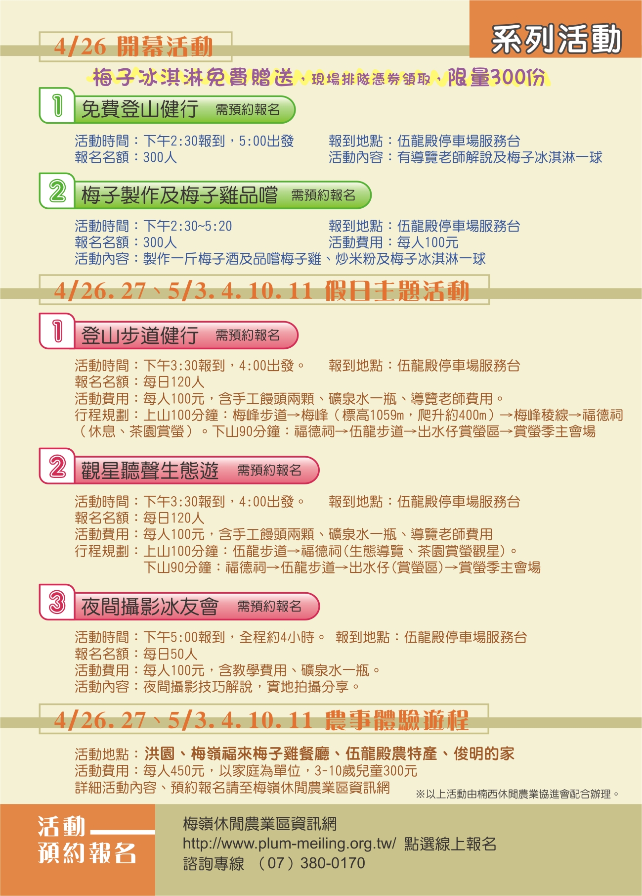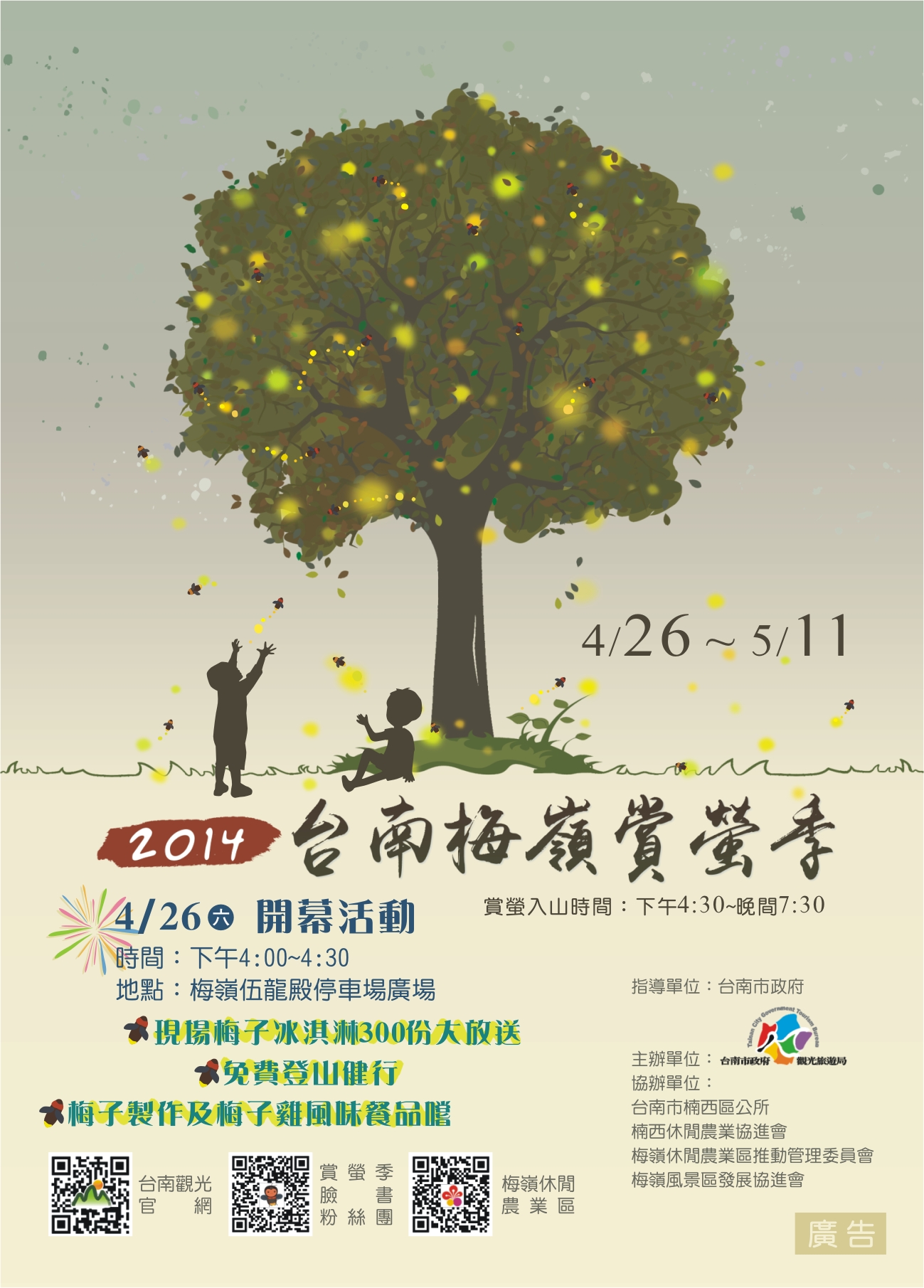众所期盼的2014台南梅岭赏萤季,将於4月26日至5月11日共16天在梅岭伍龙赏萤步道登场,今(23)日在新营民治市政中心召开记者会,由台南市长赖清德、台南市议会赖美惠议长、副市长颜纯左、观光旅游局局长陈俊安、西拉雅国家风景区管理处秘书王玟杰、楠西区公所主秘张旺根等贵宾及在地产业共同参与,邀请全国民众一同来台南梅岭赏萤观景、嚐美食,体验台南春天最美丽的萤光晚会。 台南市长赖清德致词时表示,台南梅岭的萤火虫十分壮观,整座山几百万只萤火虫闪闪发亮,宛如夜空中的一颗大钻石,可谓是自然奇观。赖市长感性的说,在星空之下、微风徐徐,有家人、朋友在旁一起观赏星光般的萤火虫,下山前再一起享用梅子鸡、带上梅子农特产伴手礼,实在是人生至乐,幸福之事;赖市长呼吁,这麽棒的景色,一生一定要来看一次,甚至应该要每年都要来,还要带着女朋友、家人阖家前往台南梅岭赏萤。 观光旅游局局长陈俊安则表示,梅岭赏萤季今年已经迈入第9年,游客人数逐年增加,相当受到欢迎。特别的是,全台各地的赏萤地点都很偏僻,梅岭是唯一一个能在居民生活圈中观赏到萤火虫的地点,不仅民众容易前往,也显见梅岭对於生态保育的重视。梅岭赏萤季不仅促进观光,也协助在地产业紮根。每年赏萤季举办时,当地业者不断推陈出新,开发多元的梅子伴手礼、梅子鸡产品,既嘉惠旅客,也培植在地产业实力。陈局长并推荐民众进行公车自助游,在大台南公车启用後,民众可藉此进行低碳观光,也可搭配此次活动特别推出的「大台南山区旅游套票」,以6.5折的优惠门票价格,将周边走马濑农场、南瀛天文教育园区、虎头埤风景区及龟丹温泉体验池等景点串连起来。 今年梅岭赏萤季主打「健康」、「生态」、「学习」新型态的生态旅游,从4月26日至5月11日,开幕活动订於4月26日(六)下午4点在梅岭伍龙殿赏萤入口广场举办,有梅子冰淇淋限量(300名)免费品嚐、登山赏萤健行观星、梅子DIY等精彩活动,欢迎民众届时踊跃参与;另每周六、日,有「登山步道健行」、「观星听声生态游」及「夜间摄影冰友会」等系列活动(需酌收费用),梅岭休闲农业区也规划了农村体验套装行程,以上各项活动均需预约报名,报名方式请至梅岭休闲农业区线上报名系统http://www.plum-meiling.org.tw/cal.php报名,或电洽报名专线(07)380-0170。 观光旅游局表示,今年市府特地推出「大台南山区旅游套票」串联走马濑农场、虎头埤风景区、南瀛天文教育园区、龟丹温泉体验池等4家业者门票票劵,原价560元,优惠价365元(约6.5折),只发行2014张,希望大家畅游台南山区後花园,发行时间为4月26日上午11时起,洽询电话06-5760121(走马濑农场),数量有限,售完为止。代售、取票地点如下:走马濑农场每日0900-1700(大门口售票处、农教中心解说服务台)、台南市农会超市【台南市东区林森路一段341号】每日0900-1700、台南市农会推广部【台南市新营区民治路5号】周一至周五0900-1700。 梅岭萤火虫是珍贵的生态资产,需要参与民众共同维护,请遵守赏萤三”不”曲:不要捕捉、不要强光照、不要大声喧哗,为让萤火虫有休息繁殖的时间及顾及游客安全,建议晚上七点三十分後不要入山,另活动期间严禁游客开车或是骑车上山,请大家务必配合,共同维护这难得的生态资源。 另外,为嘉惠利用大众运输系统的民众,於活动期间每天增开晚上9时绿22公车末班车从梅岭二层坪回玉井,方便游客利用本车次转乘回到台南市区,另搭乘公车赏萤游客可向司机索取证明兑换风景明信片一份;同时至配合餐厅消费满800元、农特产商家消费满200元及旅宿消费皆可兑换风景明信片一份,平日於梅岭资讯站兑换,假日於伍龙殿服务台兑换。另赏萤季每周六、日下午四时起至晚上七时三十分,有免费境内接驳车,从梅岭资讯站发车至二层坪停车场,回程由下午四时30分起至晚上九时三十分,从二层坪停车场发车回梅岭资讯站,欢迎大家多可利用。更多详细活动资讯请上「台南观光」网站(http://tour.tainan.gov.tw/)或电洽(06)635-3226(平日)谘询。