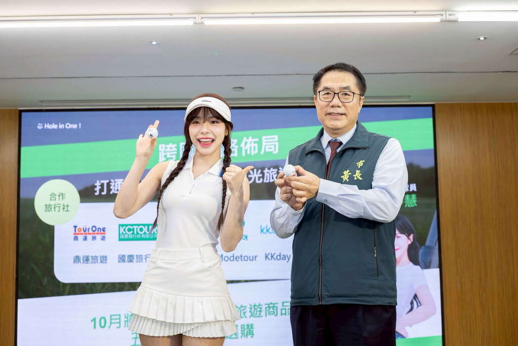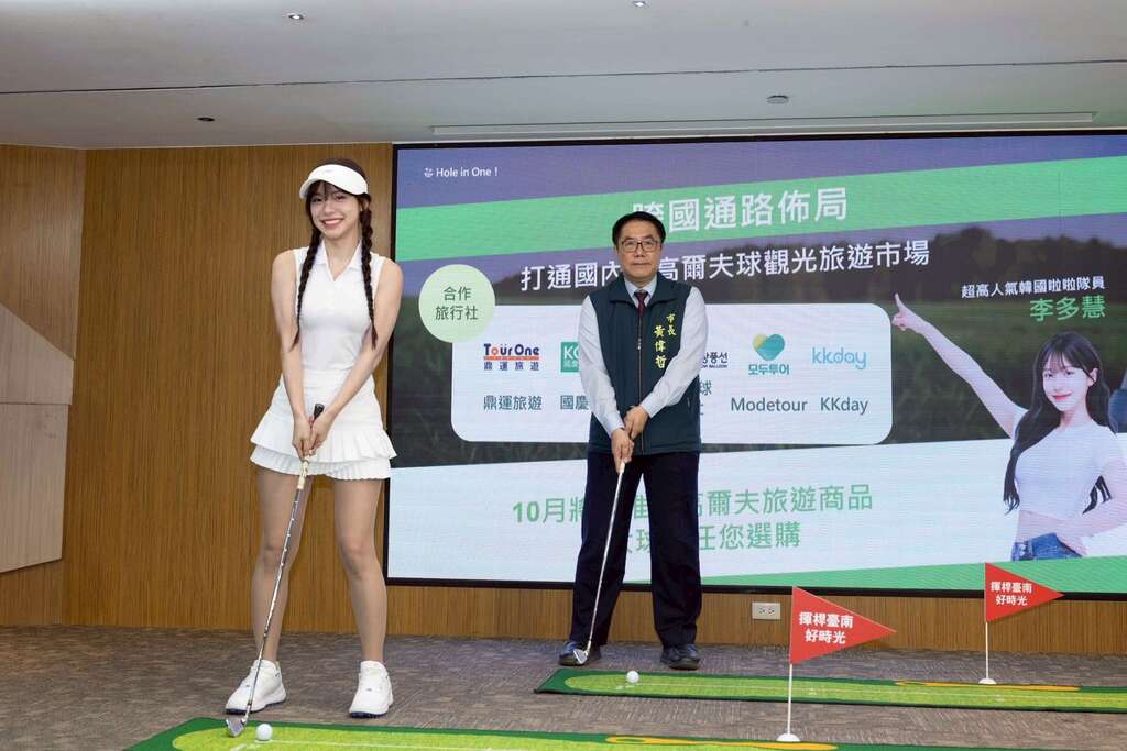 台南市政府观光旅游局持续推动高尔夫球运动观光,今年以「Hole in One!」为主题,於今(24)日於永华市政中心举行记者会,许至椿议员、立委陈亭妃服务处代表、立委林俊宪服务处代表、议长邱莉莉、议员郭信良、林依婷、蔡淑惠、卢崑福、李启维、李宗霖、林燕祝、施余兴望等议员服务处代表、台南各观光相关公协会代表及鼎运旅游集团、国庆旅行社等贵宾亲临现场共襄盛举。本次推广计画结合台南五大高尔夫球场及周边景点与美食规划特色游程,搭配动滋券推广,并再度瞄准国际市场,邀请韩籍超高人气啦啦队员李多慧踩线代言,期透过拥有跨文化影响力的名人效应,有效吸引年轻族群与海外运动爱好者的目光,提升台南国际运动观光品牌能见度。