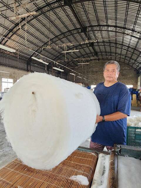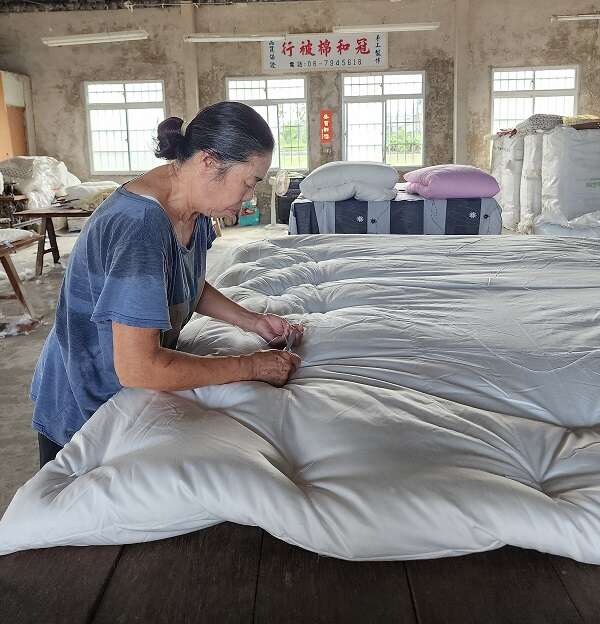 蔡顺龙说,手工被舒适耐用的关键在於铺棉,要纵横交错、中间厚四边薄,才能贴合人体,达到保暖效果。只见他拿着有如巨大棉花糖的棉卷,轻轻转动拉甩,一手拿竹条拍打压实使棉花平整,最後收边,看似轻盈俐落、一气呵成,却需要巧劲与技术。他说,早期全靠手打棉花,夫妻一整天只能做两床被子。现在尽管有梳棉机辅助,但紮实工序仍然耗时费力,一天三人顶多能做20件手工被。尤其棉絮漫天飞舞,厂里不能装冷气和开电扇,夏季室温高达38度,得挥汗工作,非常辛苦。