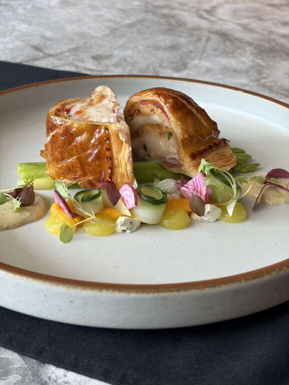 年轻品牌微醺餐酒馆主厨邱丁修以台南鲷鱼裹上鱼肉慕斯,加上帕玛森火腿和酥皮包裹起来,烤至金黄,佐以用台湾啤酒焖煮并加入台南七股蚵仔调制成的奶油酱。邱丁修说:「很荣幸能参加2025 TIFBC,并代表微醺餐酒馆参赛。此次选择用威灵顿牛排来展示台南鲷鱼。因为此料理是餐厅招牌菜,同时我也热爱台湾啤酒,故以台啤入菜。感谢主办单位,赛事组织得非常出色,我爱台湾,希望未来能多多参加比赛!」