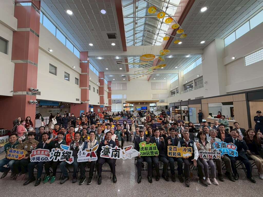 继台南熊本航线12月23日首航,台南直飞日本冲绳航线今(25)日启航!象徵台南国际航网再度升级,并与「台南—熊本」航线串连,全面打开台南连结日本西南部的重要空中门户。今日首航仪式黄伟哲市长、台南市政府观光旅游局郑道立副局长、新闻及国际关系处苏恩恩处长、陈亭妃立委、林俊宪立委、许智杰立委、台南市议会陈皇宇议员、陈怡珍议员、沈震东议员、郭鸿仪议员、林冠维议员、李啓维议员、周嘉韦议员、林美燕议员与各立委及议员服务处代表、台湾虎航总稽核宋仲奋、台南航空站杨益瑞主任、内政部警政署航警局高雄分局台南分驻所林荣春所长、内政部移民署陈介章队长、财政部关务署高雄关蔡昌宇简任稽核、卫福部疾管署南区管制中心吴美玲副研究员、台江国家公园管理处张顺发处长、云嘉南滨海国家风景区管理处徐振能处长、各航空公司、旅行社、相关企业单位、台南在地各观光公协会代表等贵宾,以及首航旅客齐聚一堂,共同见证这历史性的一刻。