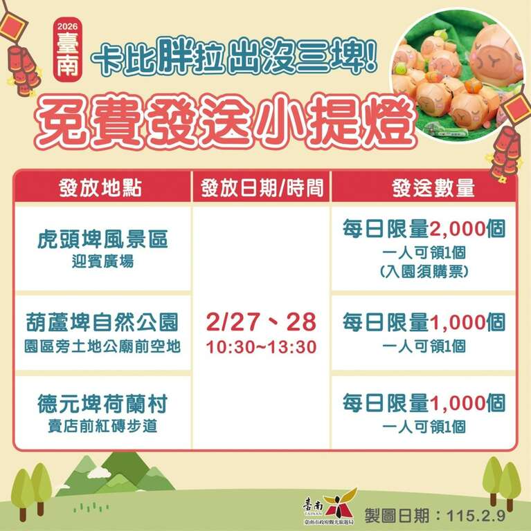 南市观旅局长林国华表示,台南的埤塘众多,也是台南持续发展观光的亮点元素之一,感谢交通部观光署针对埤塘观光发展的支持,在2月27日及2月28日二天的每日上午10时30分起至下午1时30分,观旅局将在新化区虎头埤风景区免费发送2,000个(入园需购票)、官田区葫芦埤自然公园及柳营区德元埤荷兰村则每日各免费发送1,000个,欢迎民众排队领取,送完为止。此外,虎头埤风景区115年2月7日至3月8日办理「2026卡比胖拉出没虎头埤!新春『豚』好运」活动,於埤中展出高12米的卡比胖拉「慢活汤柑」大型气偶,游客只要跟园区内卡比胖拉气偶合照并上传台南旅游脸书粉丝团活动贴文,就有机会获得卡比胖拉水壶或提袋,为新的一年「豚」聚好运,储备无限元气!