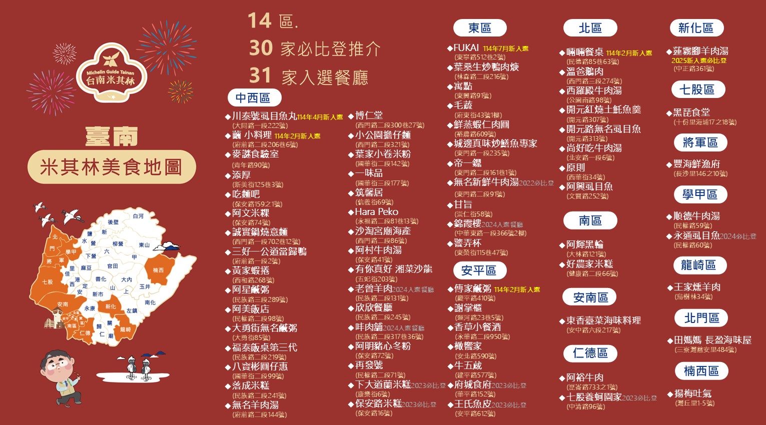 类别特色主题地图附件档案2025台南米其林美食地图-202501118更新(.jpg)台南米其林店家资讯-20250820更新(.pdf)2025台南米其林美食地图 List of Michelin-starred Restaurant in Tainan (English)(.pdf)2025台南米其林美食地图 台南ミシュランレストランリスト (日本语)(.pdf)2025台南米其林美食地图 타이난 미쉐린 가이드 (한국어)(.pdf)相关照片 问题回报上一则 回列表 下一则