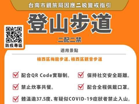 南市觀光旅遊局局郭貞慧表示,園區景點放寬部分之管制措施包括放寬虎頭埤、雙春、德元埤及葫蘆埤等園區之人流由500人調整為1000人,水火同源則維持100人,並開放景區涼亭及座位區;禁止用餐則放寬調整為禁止共餐;另外餐廳內用依據本府經發局指引辦理;而虎頭埤風景區之太陽能船則加入服務行列,於楠西區梅嶺梅龍及觀音二條步道登山步道部分則開放景觀平台供遊客休憩空間;同時戶內、外原規範之5人、10人群聚之限制也調整成戶外100人、室內50人。於市府觀旅局其餘登山步道包含東山區獅額山步道、楠西區梅峰古道、南化區紫竹步道,因近日山區大雨,會再進一步盤整安全評估後,未來也將加入開放行列,南化區龍湖步道則因為近期大雨沖刷,步道及欄杆部分受損,規劃進行災修開口修復後再開放;而在龜丹溫泉體驗池冷、熱水區泡腳池部分,則配合委外業者規劃,在之後降級時,規劃納入服務行列。