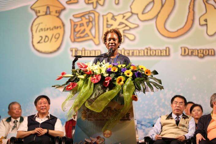 This is Saint Christopher and Nevis Ambassador Jasmine Elise Huggins' third time celebrating the Dragon Boat Festival in Tainan. As the most senior official of the group, she spoke on behalf of the foreign representatives. Huggins thanked Tainan City government for their annual invitation and warm hospitality, and pointed out that Tainan's charm comes from not only its traditional culture and delicious snacks, but also its kind and friendly people. As a foreigner living in Taiwan, this is especially impressive. In the end she remarked that the representative team has never won any dragon boat races in Tainan, and jokingly asked the City Government team to let them experience the joy of winning for a change.