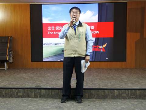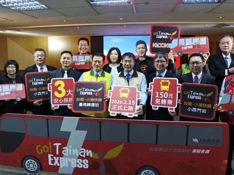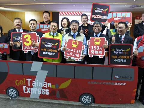 A "Tainan Express" launch conference was held by the Tainan City Tourism and Travel Bureau today (2019/12/26). Guests included Tainan Mayor Huang Wei-che, city councilors Tsai Wan-chuan and Li Chi-wei, assistant Tsai Jing-yi from the office of councilor Lu Wei-yin, Director Chen Hsin-an from Tainan City's Tourism and Travel Bureau, Director-General Wang Ming-te from Tainan City's Transportation Bureau, General Manager South District Han Hong-kai from Han-Cheng Bus Traffic Co., Marketing Director Lin Yao-ming from KLOOK, Senior Business Development Manager Tsai Yue-ting from KLOOK, President Wu Chun-tai of Tainan Hotel Association, President Chou Jung-tang of Tainan Homestay Culture Association, President Hong Chia-pao of Tainan Culture and Tourism Industries Association, General Manager Li Ching-wen of Silks Place Tainan, General Manager Yen Hsin-I of Tayih Landis Hotel Tainan, General Manager Chou Li-hua of Shangri-La Hotel Tainan, Deputy General Manager Lin Yung-tsun of Evergreen Plaza Hotel (Tainan).