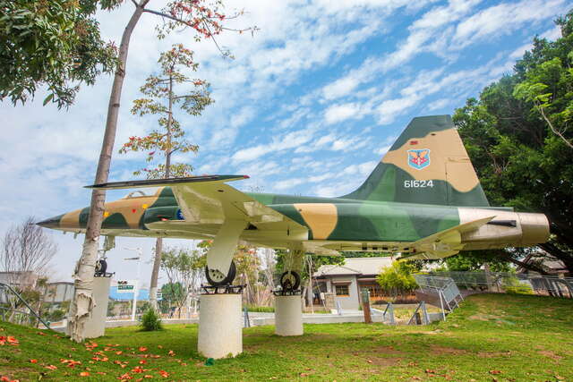 2019年末、眷村の姿を保存した水交社文化園区がオープンしました。園区内の瓦屋根の家屋の上方にはコンクリートの台面が架けられ、壁面に木の格子窓をはめ込み、排水管が瓦の軒を走って下へ伸びています。建物の周囲には用水路が掘られ、さらに長いアシが畑でゆらゆら揺れています。園区の生態はそれだけでなく、池では緑の葉が美しく上品な蓮の花を引き立て、古い木の根が壁の上で絡み合い、人々は会話に花を咲かせ、静かな散策のひと時を過ごしています。また園区内にはF-5E戦闘機があることから、「飛行機眷村」とも呼ばれています。