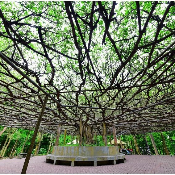 一旁的大榕樹已經舖天蓋地的由中心向外幅射伸展超過一個籃球場大,氣勢驚人,與桃花心木林交疊出不同層次的綠意,氣勢驚人。