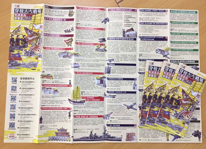 「穿梭古今戰場 解讀臺南軍事史」插畫摺頁地圖已於7月21日推出囉!這次的地圖選擇從軍史的角度看臺南,介紹各戰事遺址、其歷史背景及各大軍機設備展示處共43個景點。美術編輯的部分再度邀請知名插畫家Croter洪添賢進行規劃設計,本身也是軍事迷的他,運用簡單三色與顏色深淺帶出插畫的光影變化及懷舊感,藉以喚醒人們對於那個艱辛年代的記憶與懷念。這次一口氣推出了中、英、日三版本,即日起提供民眾免費索取,歡迎民眾前往臺南各旅遊服務中心、永華及民治市政聯合服務中心索取,也可至「臺南旅遊網」(https://reurl.cc/621XMr)下載。