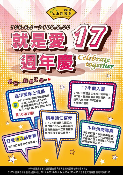 台糖尖山埤江南渡假村 Jianshanpi Jiangnan Resort 為歡慶17週年慶推出「17遊江南」入園優惠,9月份凡國曆出生年月日同時有1與7者、醫護警消及軍教榮民,憑證即享入園 #半價優惠。