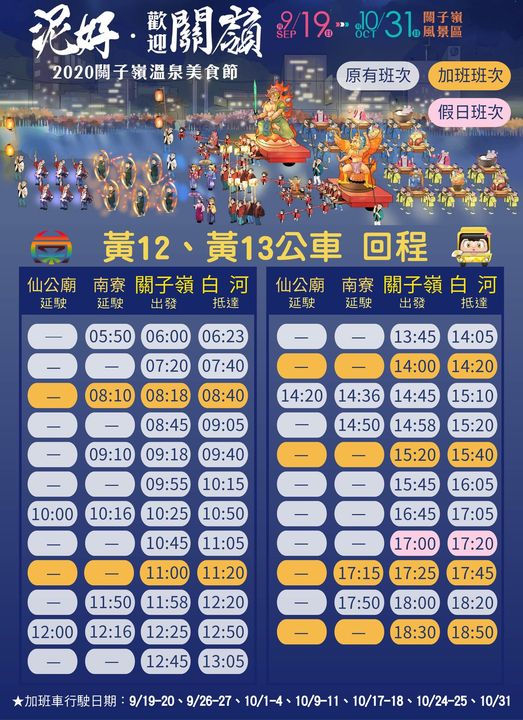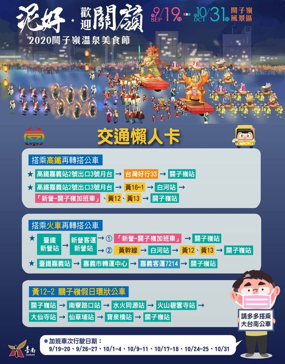 🚌今年市府交通局也特別為活動加開(9/19~10/31)活動限定【新營-白河-關子嶺】的直達車次哦!歡迎大家躍踴搭乘~