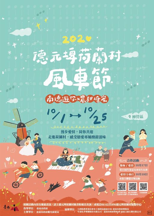 2020 #德元埤荷蘭村風車節 將於10/1起上場與大家見面囉!今年風車節搭配2020年的浪漫數字意涵定調,以「南德遊你x農甜塘蜜」作為主題,納入荷蘭的特色風車融入於主題中。