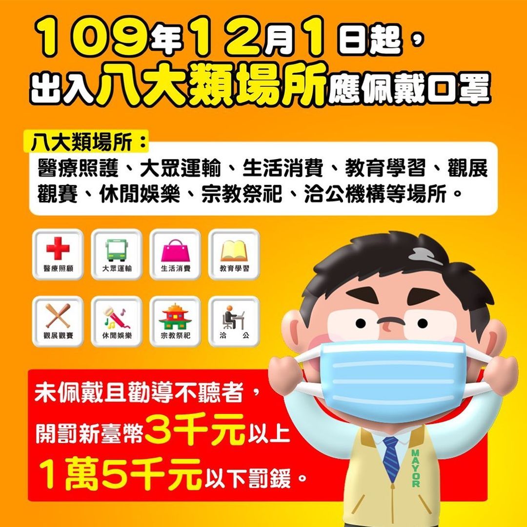 12月1日起,民眾進出8大類場所須強制戴口罩、加強醫療院所通報採檢,入境及轉機者登機前須附核酸檢驗報告。