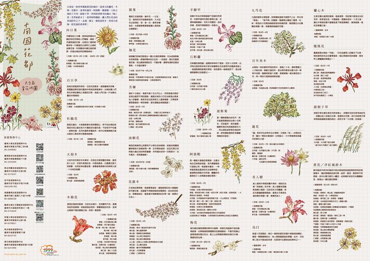 「南國花都」插畫摺頁地圖於今日推出囉!彙整大台南各區特色花卉及綠隧賞花木之相關資訊並提供臺南各區多處賞花點,讓旅人們抓住每個開花的瞬間,不會再因為錯過花期而搥胸頓足。美術設計的部分,邀請了身兼作家、自由插畫家、平面與視覺設計師的Sybil何芊澐進行整體規劃設計,喜愛賞花及親近大自然的旅客千萬別錯過。摺頁地圖即日起提供民眾免費索取,歡迎民眾前往臺南各旅遊服務中心、永華及民治市政聯合服務中心索取,民眾也可至「臺南旅遊網」(https://reurl.cc/x0V9D5)下載。更多資訊請上「臺南旅遊網」查詢。