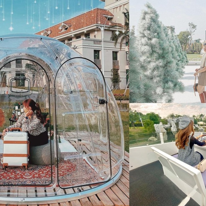 在 萬國通路創意觀光工廠 ,兩款風格的水晶球置身大片草地,歐風園區還設有期間限定的杉木