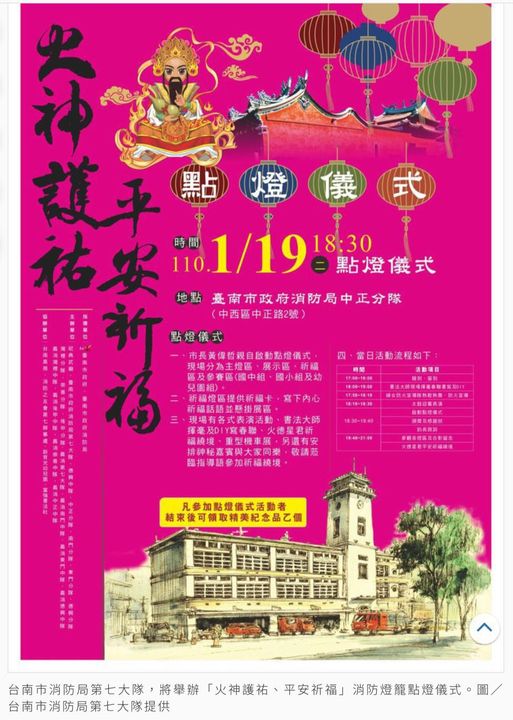 為推廣古蹟防災及居家防火意識,台南市消防局第七大隊特別結合祀典武廟的「火德星君」辦理「火神護祐、平安祈福」之消防燈籠繪畫比賽,燈籠作品陸續在合同廳舍建築外觀完成佈置,1/19(二)將點燈~