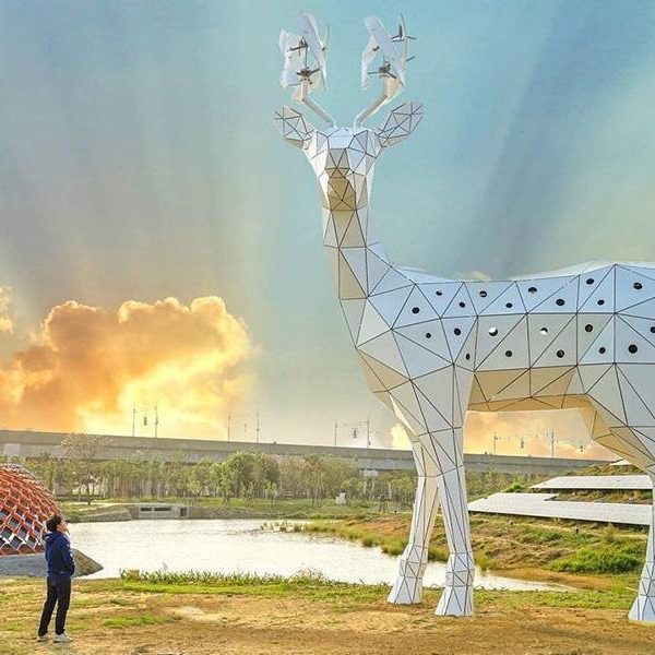示範場域內近期出現二隻巨大梅花鹿「風之使者」,身體由白色的氟碳烤漆鋁板構成,角上則裝設風力發電機,高度約為11.8公尺,各矗立在廣場草坪與建物邊坡上,讓人有置身夢幻國度的感覺☺️☺️
