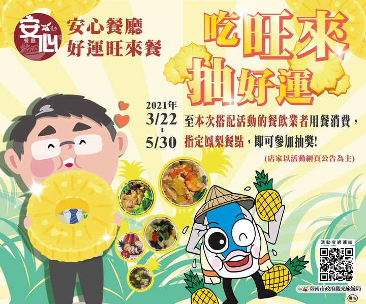 民眾凡於110年3月22日至5月30日,至本次搭配活動的安心餐廳業者用餐消費指定鳳梨餐點(不限金額),即可登錄發票或收據參加抽獎(發票上傳日期至5/30 24:00止)。活動獎項包括 #NintendoSwitch主機+遊戲、#臺南市知名飯店住宿券、#臺南美食抵用券等,總獎項超過100份,趁著4月 #兒童節、#清明節 連假造訪臺南,一邊吃著好運旺來餐,一邊漫遊臺南遇見全糖的甜蜜幸福。