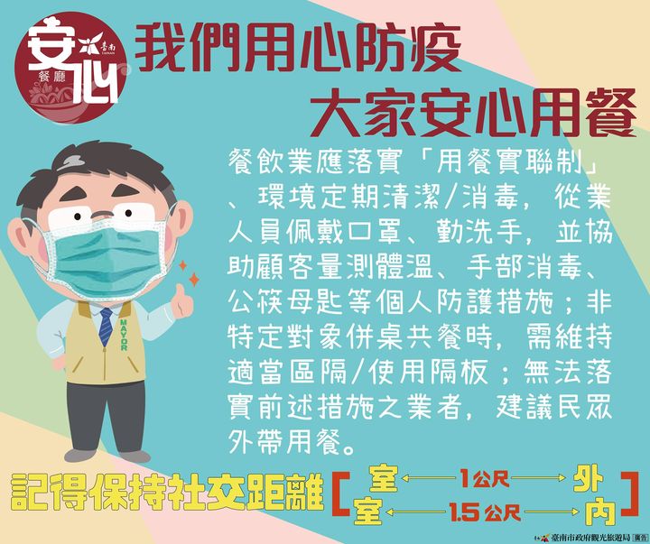 6. 餐飲業應落實「用餐實聯制」、環境定期清潔/消毒,從業人員佩戴口罩、勤洗手,並協助顧客量測體溫、手部消毒、公筷母匙等個人防護措施;非特定對象併桌共餐時,需維持適當區隔/使用隔板;無法落實前述措施之業者,建議民眾外帶用餐。