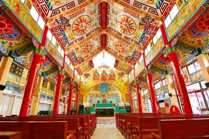 🇹🇼#台南 #鹽水天主聖神堂 ⛪️明明是天主教,卻有著廟宇式的建築,內部更是中西合併的極致,連名畫最後的晚餐都改成了漢化版,食物變成包子,人物還拿著筷子等中式餐具,如此東西宗教文化合併的大作改造,都是為了融入地方,讓當時更多人容易接受新的宗教觀🤗