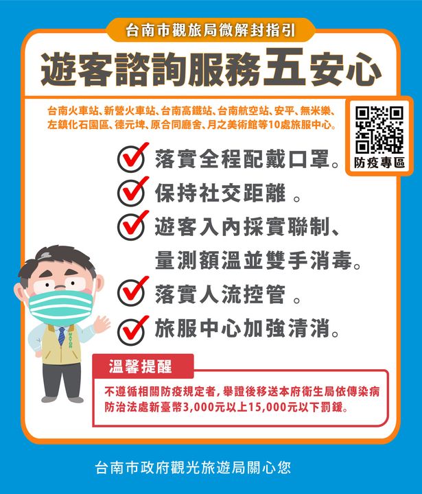 目前台南各地景點仍嚴格落實防疫作為,第一波微解封項目包含10處旅遊服務中心、7大風景區、2條所轄登山步道、2處觀光遊樂業,以及88線與山博行線2條台灣好行公車服務等23項微解封場域與服務方案。