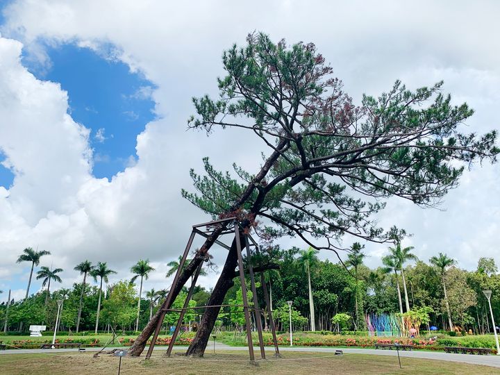 隨著時間流轉,其他幾棵琉球松陸續凋零,至今只剩下宮之森圓環的這棵了😇。因為這幾棵琉球松有著與眾不同的來歷,因此108年開館前,在館舍整建工程進行時,上一棵死亡的琉球松軀幹便被館方特意保存下來,以期日後可以找到延續其生命價值的方法。🌱✨