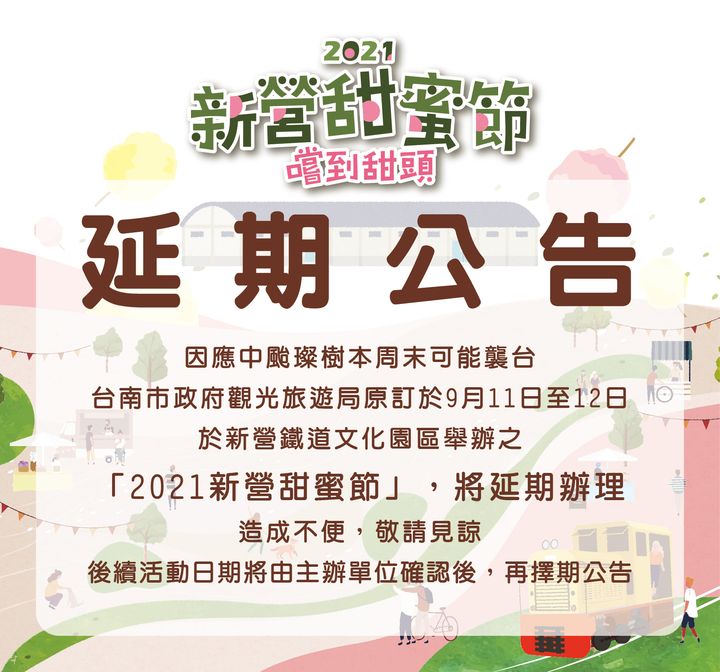 台南市政府觀光旅遊局原訂於9月11日至12日於新營鐵道文化園區舉辦之「#2021新營甜蜜節」,將延期辦理。