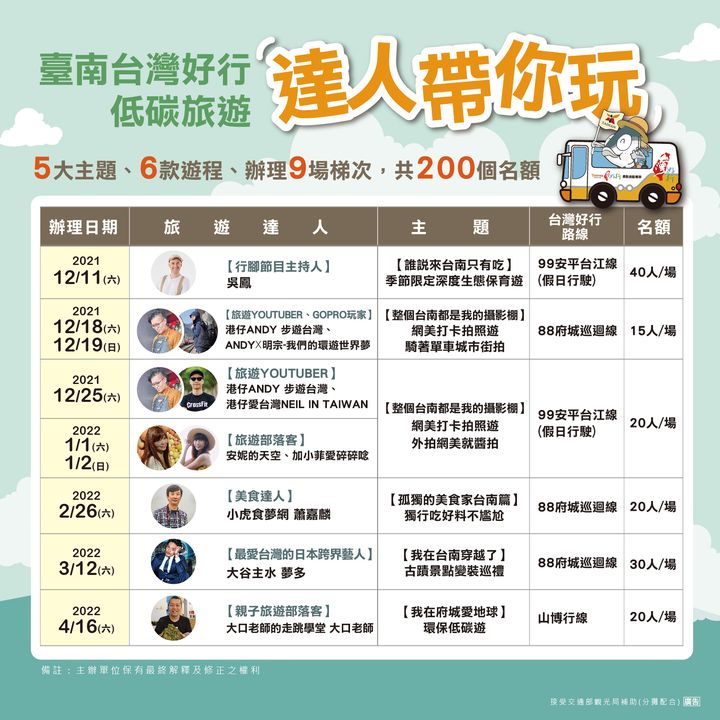 敬請大家保握機會與旅遊達人體驗低碳旅遊、輕鬆暢遊台南🙌