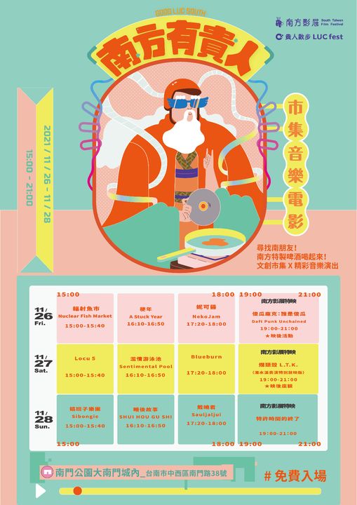 午後15:00-18:00南門城化身表演場館,由 2021 LUCfest 貴人散步音樂節 選團,每日三組音樂表演團體輪番上陣,帶您感受台灣獨立音樂豐沛的能量!