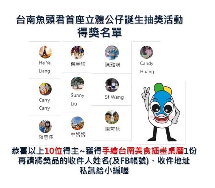 台南魚頭君首座立體公仔誕生抽獎活動 開獎啦
