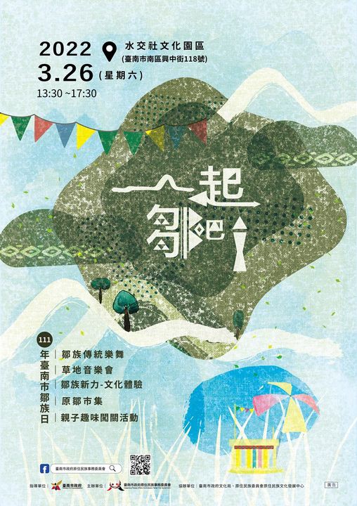 臺南市政府原住民族事務委員會將於3/26(六)下午1:30-5:30在水交社文化園區舉辦「一起鄒吧!」─111年臺南市鄒族日活動。