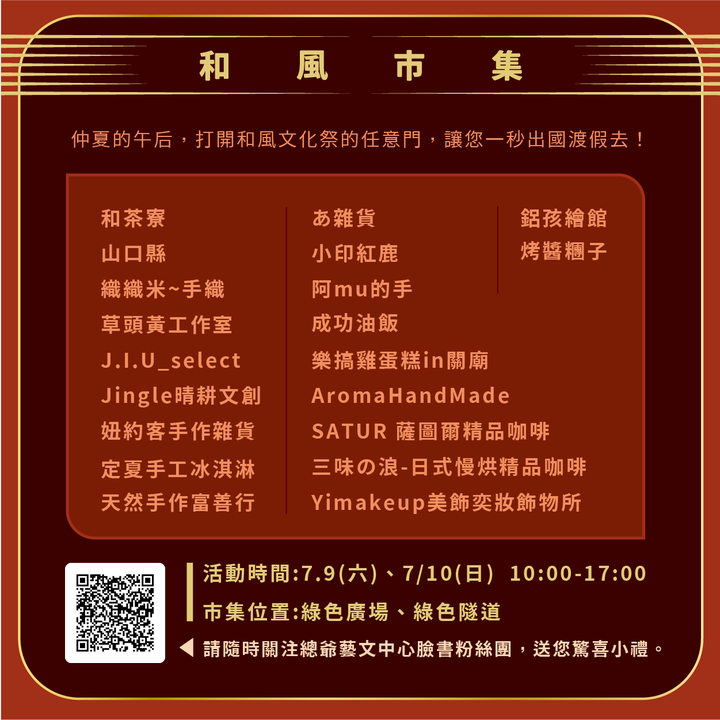 7/5中午前到總爺藝文中心和風文化祭活動貼文底下留言tag三位好友有機會獲得精美小禮哦~🎁🎁🎁