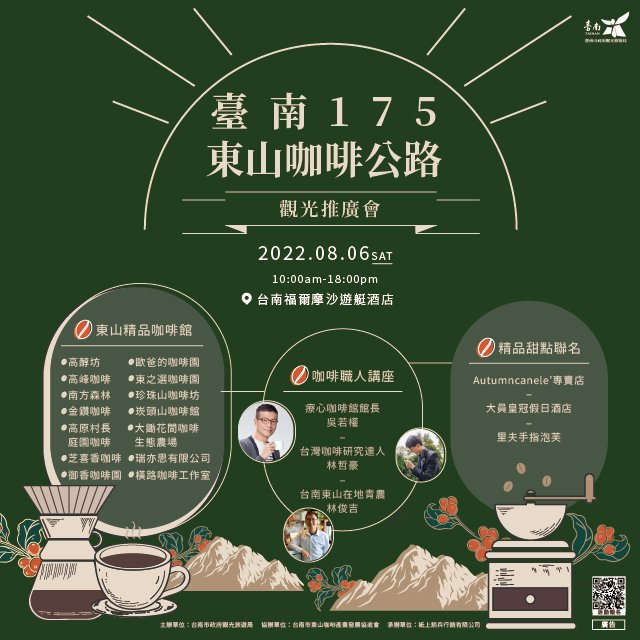 東山精品咖啡館:大鋤花間咖啡生態農場、橫路咖啡工作室、高原村長庭園咖啡、芝喜香咖啡、崁頭山咖啡館、東之選咖啡園、高醇坊、高峰咖啡、珍珠山咖啡坊、瑞亦思有限公司、御香咖啡園、歐爸的咖啡園、金鑽咖啡、南方森林。(早鳥券可任選攤位兌換兩杯,每杯價值NT$200)