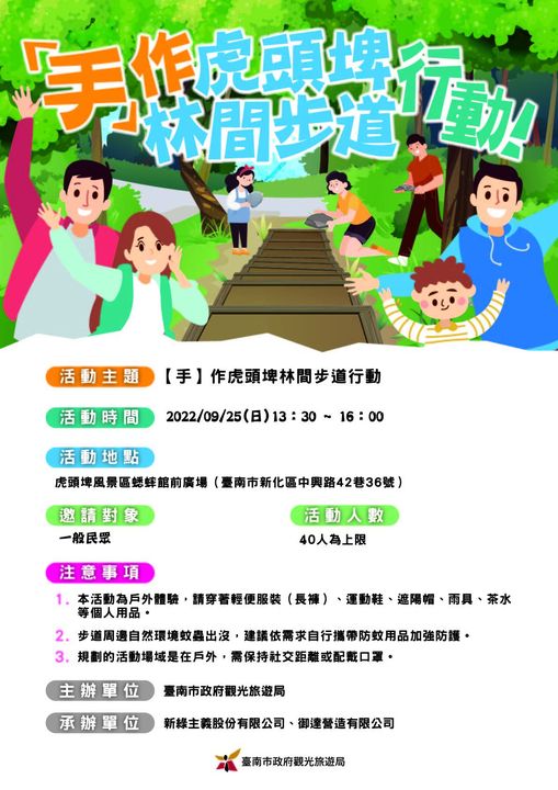 📢跟隨著講師的腳步👣走入虎頭埤步道,徜徉於充滿芬多精的森林🌲環境中一起修築步道,並運用傳統工法⚒執行手作步道,用雙手重拾🪨與土地的關係。