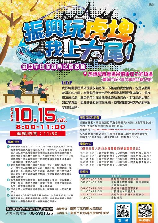 振興玩虎埤 我上大尾! 路亞竿環保釣魚比賽,10/15(六)8:00~9:00報到並出示發票領取參賽證,中午11:00前收魚收桿秤重。