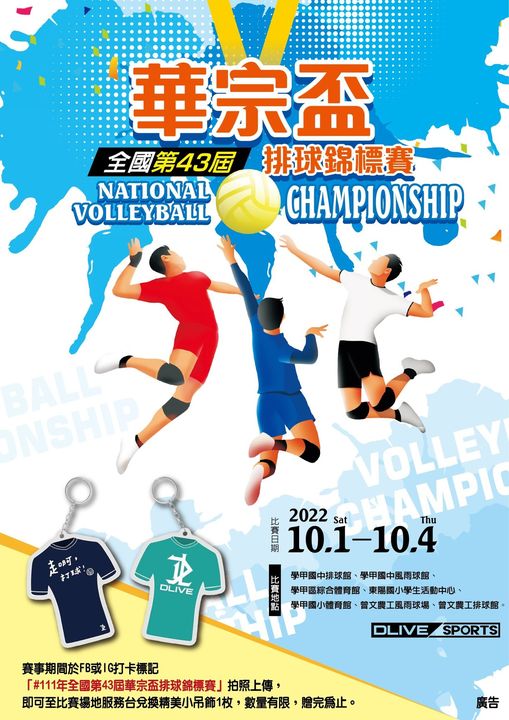 賽事期間於fb或IG打卡標記「#111年全國第43屆華宗盃排球錦標賽」並拍照上傳,即可至比賽場地服務台兌換精美小吊飾1枚,數量有限,贈完為止。