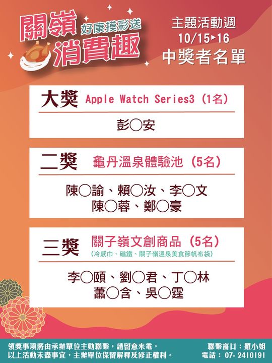 1️⃣主題活動週(10/15-16)的關嶺消費趣~中獎者名單出爐啦