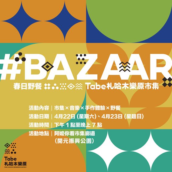 📣報名方式及內容請洽Tabe札哈木樂原臉書活動日期:4/22(六).4/23(日) 13:00-19:00
