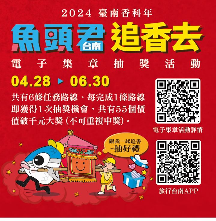 共有 #6條任務路線,每條路線須走訪集章點找到AR魚頭君,完成任務即可參加抽獎,6條路線都完成就有6次抽獎機會,但不能重複中獎,活動獎品共有台南住宿券等55個項,每一個獎項的價值都超過千元。 🥳🥳