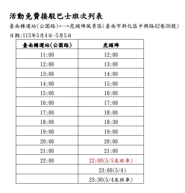 活動兩天11:00-22:00整點自台南轉運站(台南市北區公園路291號)發車至虎頭埤露營區(由後門進出),回程最末班車5/4-23:30, 5/5-22:00 發車。
