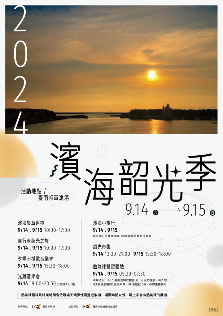 9/14.15 #將軍漁港 連續兩天舉辦 #2024濱海韶光季 ,除了有熱氣球繫留體驗,還有 #光雕音樂會、#濱海小旅行、#韶光市集、#夕陽不插電音樂會、#自行車韶光之旅 及 #濱海集章巡禮 等豐富精彩內容。
