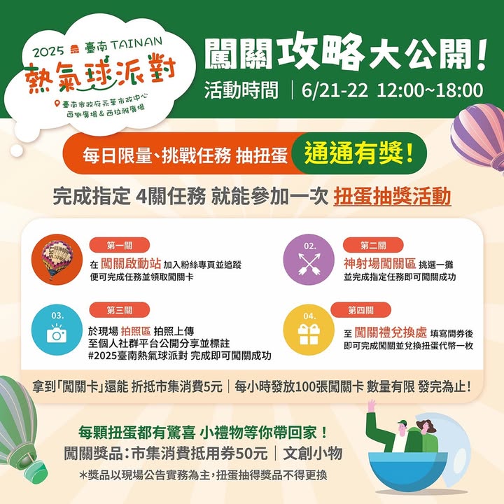 3️⃣拍照上傳至個人社群平台,並標註活動名稱「#2025臺南熱氣球派對」