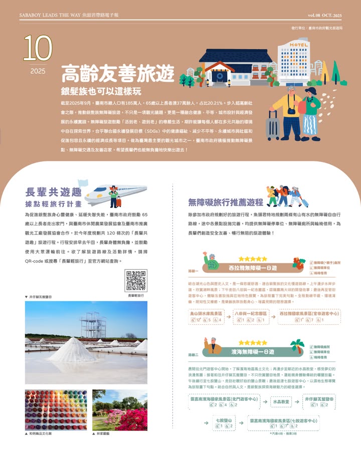 為鼓勵長輩👨🦳👩🦳走出家門、活動筋骨💪💪,十月號我們推出 #銀髮族無障礙旅遊,提供社會局舉辦「#據點輕旅行」介紹、推薦遊程、#無障礙交通 及 #銀髮友善餐廳 等資訊,希望長輩們透過郊遊踏青與人互動,促進身心健康、延緩退化,打造充實樂活的高齡生活。