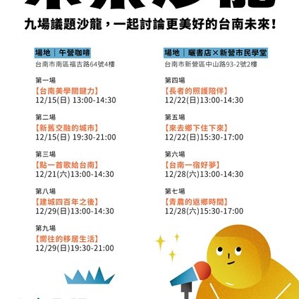 2020年即將到來,讓我們一起討論與想像更美好的台南,在12月年末,為期九場的議題沙龍,我們邀請在各個領域努力打拼的造夢者參與,一起坐下來討論台南的現況與未來藍圖,讓台南成為實踐夢想的造夢城市~
