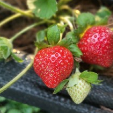 在台南善化、新市有一大片草莓園就在路邊,以一般落地栽培法外,也有許多屬於高架栽培的方式,而品種以香水草莓居多,上週開始已有親子到草莓園