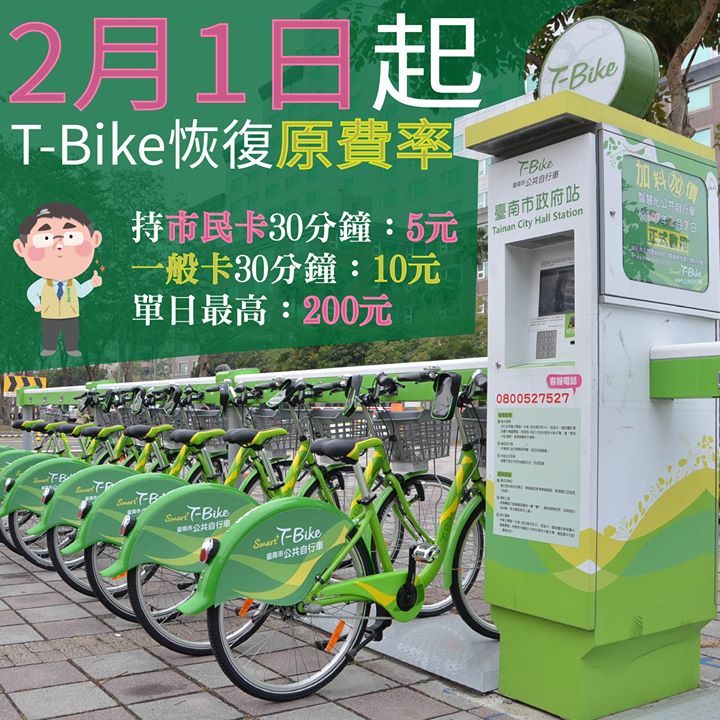 ✅今年2月1日起,台南市公共自行車T-Bike恢復原費率囉~