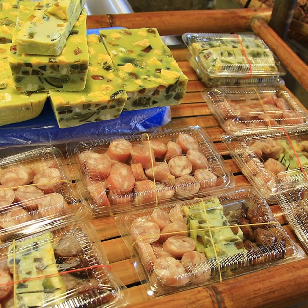 台南關廟公有菜市場裏的傳統小吃-糯米腸、高粱酒香腸、各式滷味都在「食秫古早味‧小區大腸」!