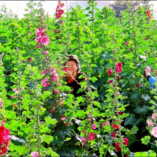蜀葵花又稱「一丈紅」,花色多又大,相當豔麗,一旁還有紅藜花海和小麥田,開幕當天有學童